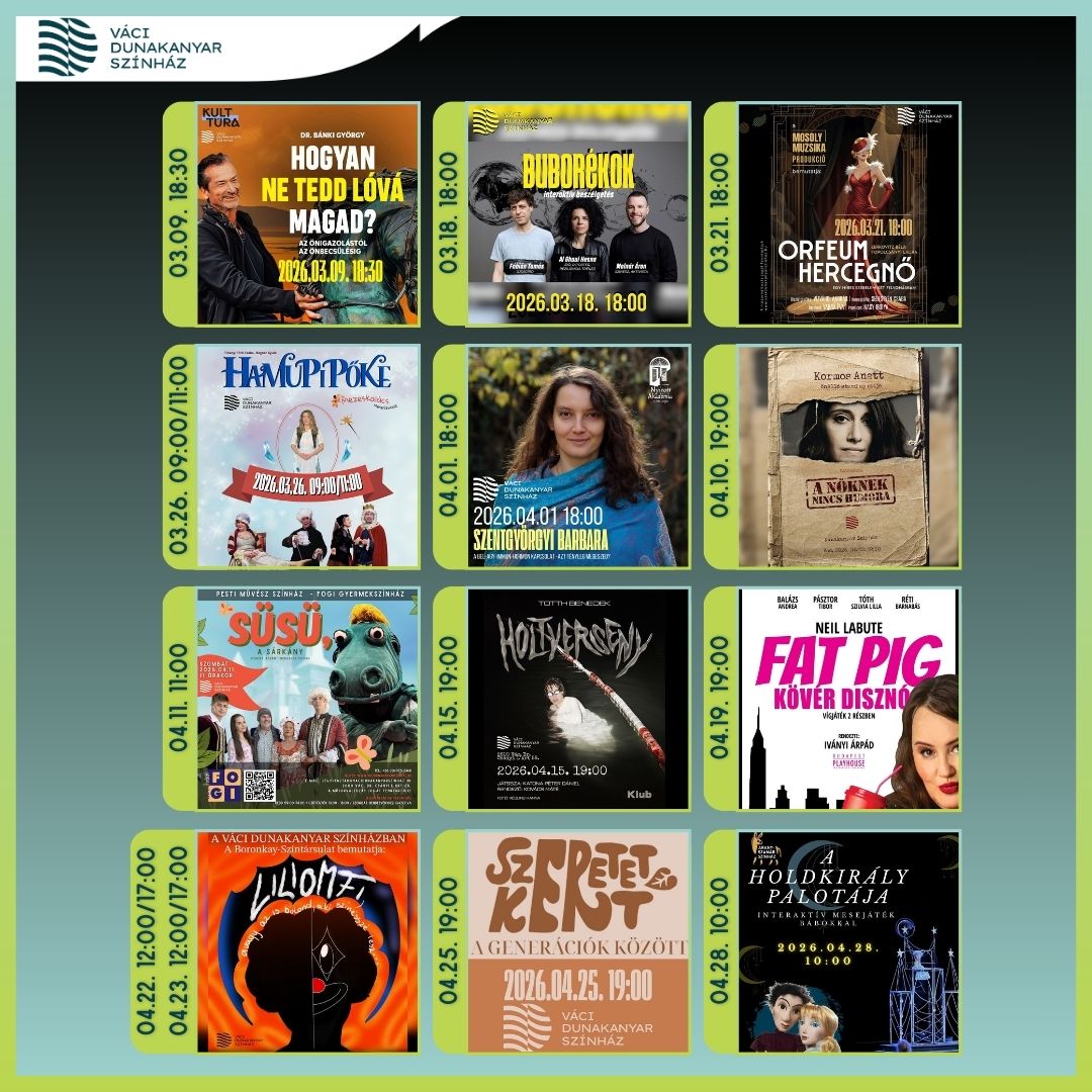 A színházi programok között megtaláljuk a klasszikus és kortárs darabokat egyaránt: érkezik A Pál utcai fiúk zenés játéka, látható lesz A Négyszögletű Kerek Erdő, valamint számos szórakoztató és elgondolkodtató előadás, köztük a Dumaszínház estjei és különleges koncertszínházi produkciók. Az önismeret és lélektan iránt érdeklődők számára is izgalmas estekkel készülnek: Dr. Almási Kitti és Orvos-Tóth Noémi előadásai mélyebb önismereti utazásra hívják a közönséget.